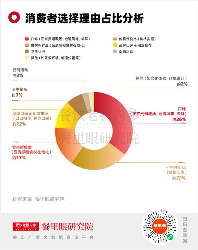 在消费者的选择理由中,集中在口味、性价比、食材新鲜度和品牌口碑。贵州酸汤的地方风味标签属性非常强,对大部分客群而言,首要选择在于尝鲜,体验正宗贵州酸汤口味。