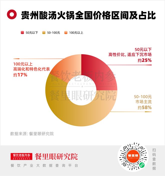 根据餐里眼数据显示,全国贵州酸汤火锅的价格带从30元到100元以上价位不等,综合来看,消费者在全国大多数连锁贵州酸汤火锅店用餐,人均花费大约在80元上下。