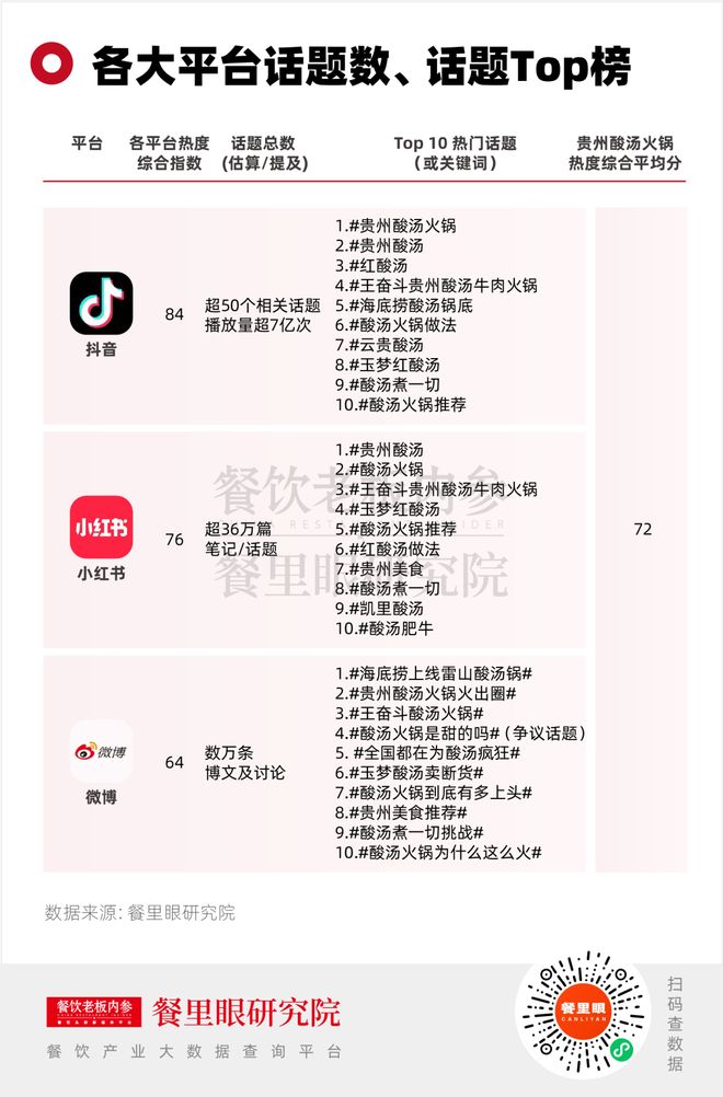 通过餐里眼数据分析,贵州酸汤火锅在社交平台上已是“漂亮饭”代表之一,综合平均分达到72分,成为年轻人可分享、可炫耀的社交货币。