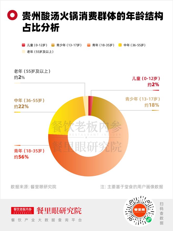 从客群画像来看,18-35岁的青年占比较高约56%,是社交平台上活跃度最高的人群,他们追求新鲜、健康和高性价比,热衷于探索发现新奇餐厅,并传播分享;其次是36-55岁的中年客群占比约22%,他们注重品质和与体验,是家庭聚餐的决策者。