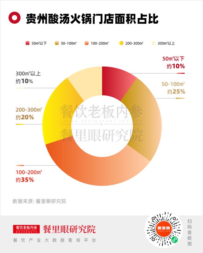 从火锅品类属性看,贵州酸汤火锅门店经营面积集中在中大型门店,50㎡-300㎡占比约80%。