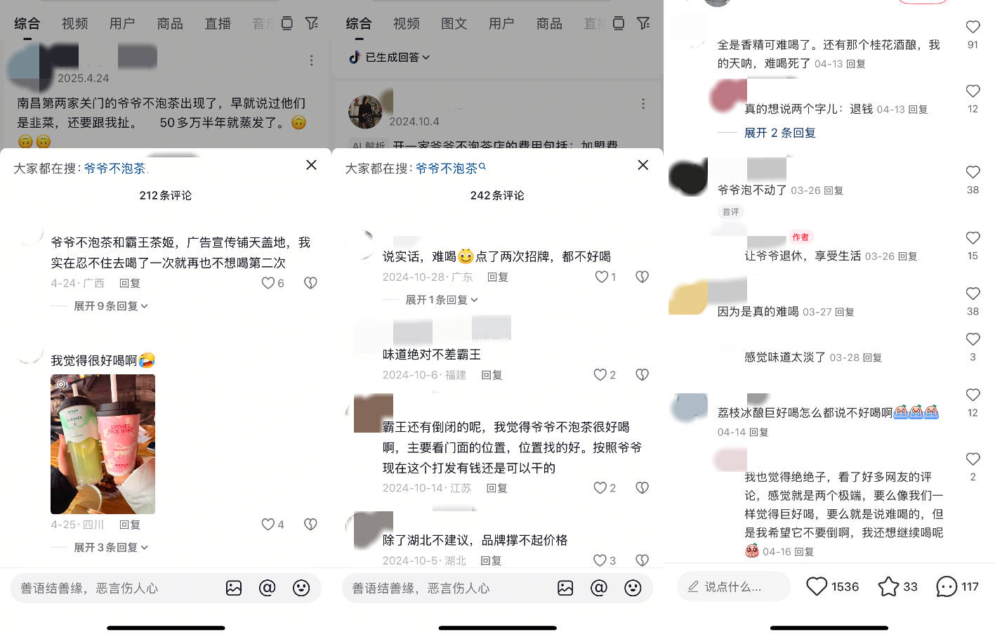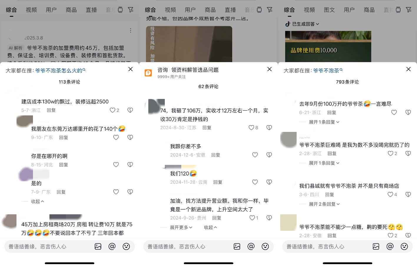 一方面,加盟商质量参差不齐。头部品牌如霸王茶姬,对加盟商要求极为严苛,加盟成本近百万元。而爷爷不泡茶将加盟门槛降至30万元左右(不含租金、人工),低门槛虽快速吸引了大量中小投资者,但也导致加盟商运营能力、资金实力参差不齐,部分加盟商缺乏茶饮行业经验,进一步拉低了单店经营水平,同时增加了管理风险。