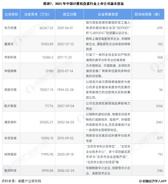 从计算机仿真行业的上市企业布局和已有公开信息分析,注册资本最多,成立时间最早的是视觉中国,招投标信息最多的是捷安高科。
